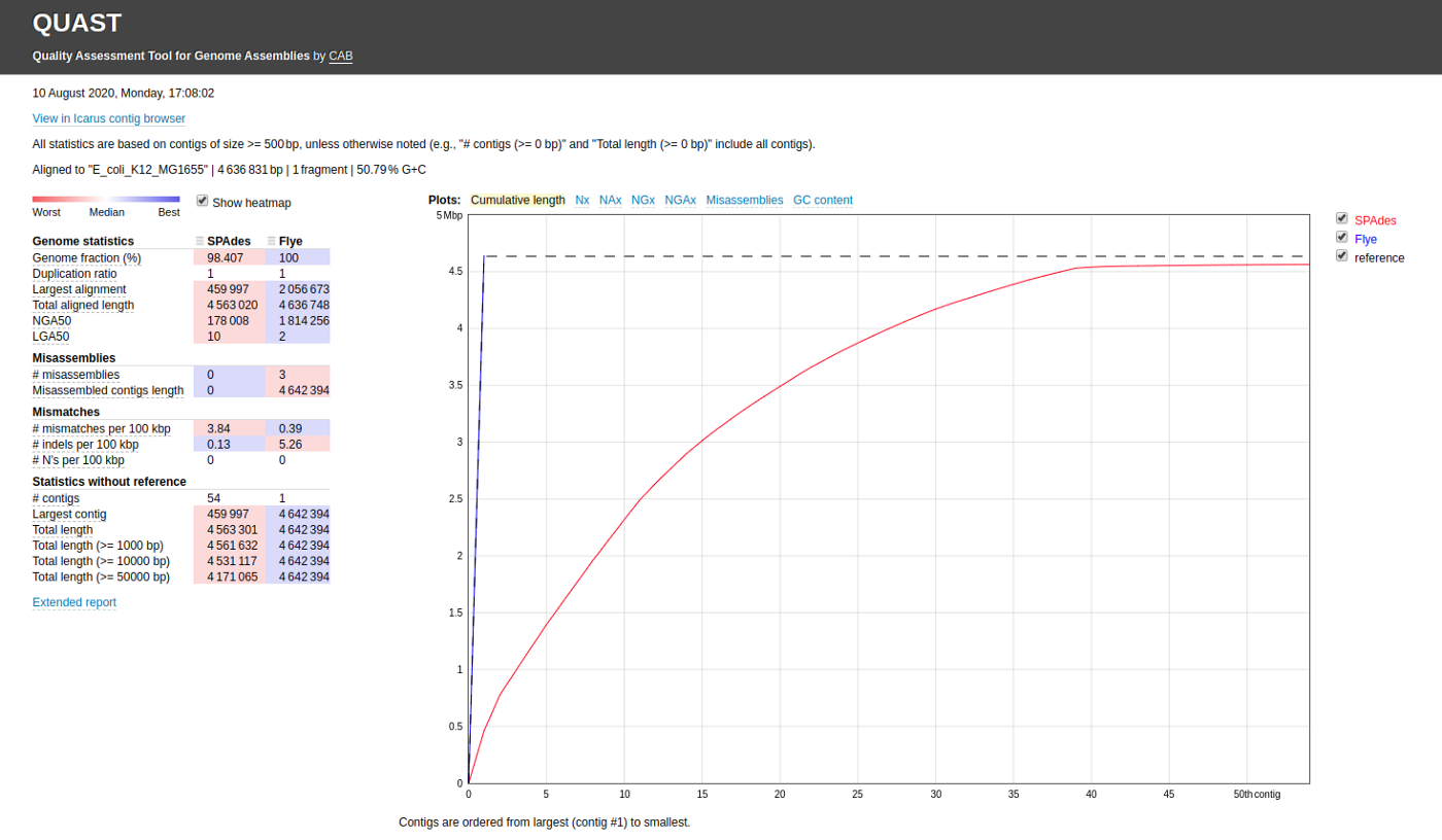 QUAST stands for QUality Assessment Tool. QUAST can evaluate assemblies using reference genomes, as well as without reference genomes. QUAST produces detailed reports, tables and plots which show the different aspects of assemblies.