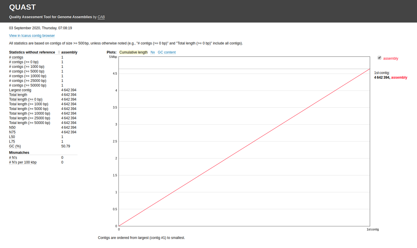 Now we have an example assembly. The contigs of the final assembly can be found in the file assembly.fasta. Let’s see how good the quality of the assembly is.