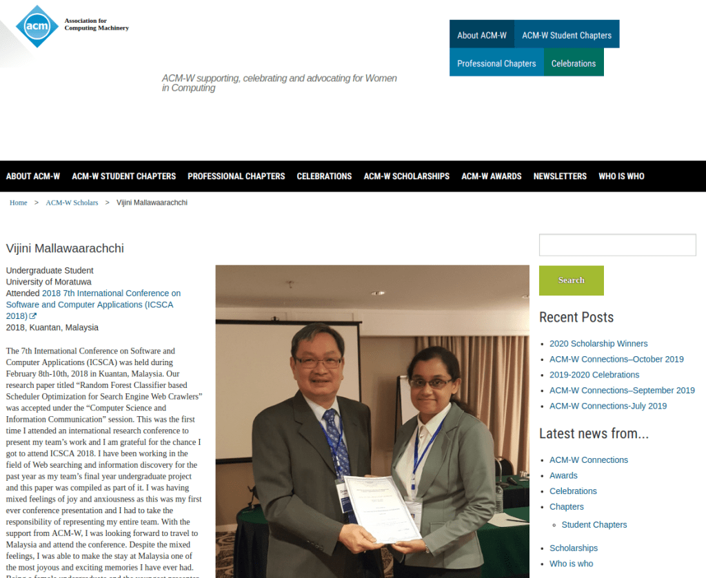 Was awarded the ACM-W Scholarship for Attendance of Research Conferences to attend the 7th ACM International Conference on Software and Computer Applications 2018, Kuantan, Malaysia.